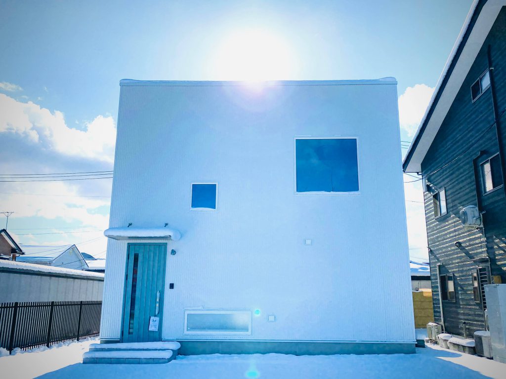 ホワイトの金属サイディング外壁と、ブルーを合わせたシャープな外観の家。広い玄関には、コートを掛けたり、自転車を入れたりすることもできます。吹抜けにある窓から差し込む光が、とても部屋を明るくしてくれます。