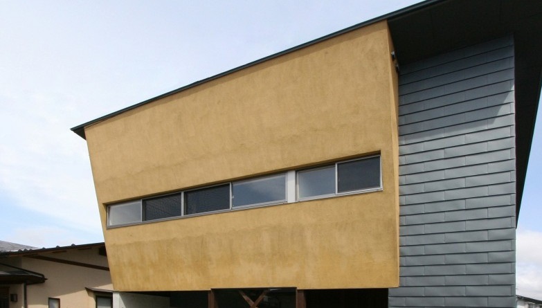 ガルバリウム鋼板の外壁に、化粧モルタル塗りを組み合わせた外観。2階にはサンルームがあり、冬場でも洗濯物を干せるのが嬉しいですね。
